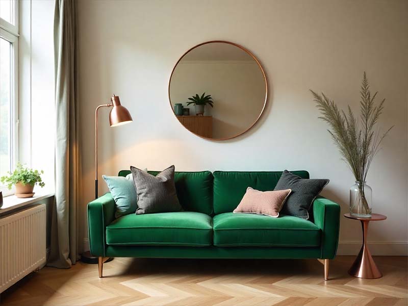 Granat, butelkowa zieleń, burgund czy terakota wydobywają szlachetność miedzi. Takie zestawienia tworzą aranżacje pełne elegancji i charakteru.