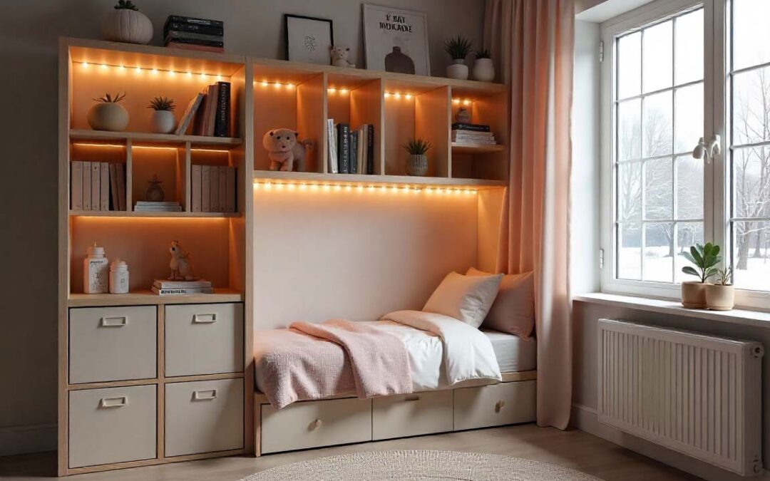 W małym wnętrzu światło odgrywa kluczową rolę. Główne źródło światła powinno być jasne, ale warto też zadbać o dodatkowe punkty – lampki nocne, kinkiety czy lampki LED przy łóżku. Ciepłe światło buduje przytulną atmosferę, a jednocześnie ułatwia dziecku zasypianie.