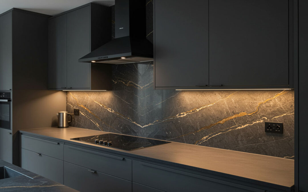 W praktyce „mocne żyłowanie” możesz uzyskać trzema głównymi drogami: kamień naturalny (np. kwarcyt, marmur), konglomerat kwarcowy lub spiek kwarcowy. Każda opcja ma inne konsekwencje dla budżetu, pielęgnacji i odporności. Jeśli zależy Ci na wyrazistym rysunku i jednocześnie chcesz minimalizować ryzyko plam i problemów eksploatacyjnych, najczęściej wybór pada na spieki albo kwarc – bo dają kontrolowaną powtarzalność wzoru i łatwiejszą konserwację. Dla spieków kwarcowych w polskiej sprzedaży detalicznej spotyka się poziomy rzędu kilkuset do ponad tysiąca złotych za m² samej płyty: przykładowo kategorie cenowe Laminam są pokazywane w widełkach ok. 322–1 586 zł brutto/m², zależnie od kolekcji i wariantu , a Neolith w wybranych ofertach pojawia się m.in. w okolicach 500–954 zł brutto/m² dla konkretnych produktów . Przy konglomeratach kwarcowych (które często wybiera się właśnie w deseniach „marmurowych” z żyłowaniem) w ofertach rynkowych spotyka się zarówno przedziały ogólne, jak i konkretne poziomy dla kolekcji Silestone: w katalogach sprzedażowych pojawiają się widełki ok. 790–1 370 zł brutto/m² dla części wariantów , a zestawienia cenowe podają, że Silestone bywa wyceniany szerzej (w zależności od wzoru) nawet 800–2 800 zł/m² . Najważniejsze: w kosztach „statement stone” sama płyta to dopiero początek – dochodzi obróbka, transport, montaż, otwory, podklejenia, zlew, krawędzie. W polskich podsumowaniach branżowych można znaleźć orientację, że w 2025 r. koszt blatów kamiennych/spieków bywa podawany jako ok. 1 500–3 500 zł/m², a sam montaż kamienia może dochodzić nawet do ~1 000 zł/m² przy złożonych realizacjach . To oznacza, że statement stone w wariancie „wyspa + blat + pion” wymaga liczenia całego pakietu: materiał + wykonanie + logistyka + detale. Dla uczciwego budżetu warto przyjąć, że największe „dopalacze” ceny to: (1) waterfall (dodatkowe boki), (2) bookmatch (parowanie płyt i większy odpad), (3) grube krawędzie (doklejki), (4) zlew podwieszany i ociekacze frezowane, (5) nietypowe łączenia pod kątem lub na wyspie „w literę L”. W zamian otrzymujesz efekt, którego nie da się tanio podrobić: monumentalność, rytm żył i wrażenie „jednego bloku”.
