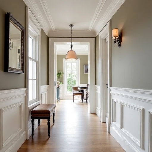 W wąskich przedpokojach sztukateria, szczególnie w formie pionowych listew lub pilastrów, może optycznie powiększyć przestrzeń. Listwy przypodłogowe chronią ściany przed uszkodzeniami, a jednocześnie nadają wnętrzu schludny wygląd.