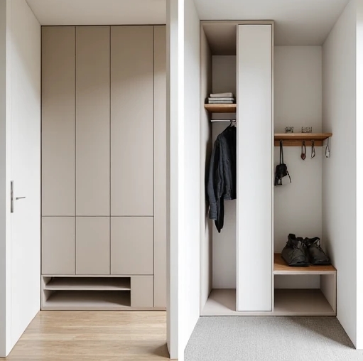 W wąskich przedpokojach zabudowy do sufitu pozwalają na stworzenie pojemnych szaf na ubrania wierzchnie, buty czy akcesoria. Dzięki nim można ukryć przedmioty codziennego użytku, zachowując estetyczny wygląd przestrzeni wejściowej.